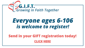 The G.I.F.T. program is the primary Faith Formation program in our new parish. G.I.F.T. Growing in Faith Together is for everyone ages 6-106! Faith learning is lifelong and this catechetical model seeks to engage parents, as the primary educators of faith in the household, on their personal and family faith journeys. With adult (one or both parents/guardian register with child) and student sessions that combine with all ages gatherings; GIFT builds community, forms and informs at all age levels. Through G.I.F.T. sessions, Sunday worship, participation in parish life and service and at home prayer and sharing, families grow in faith and help build a vibrant church.